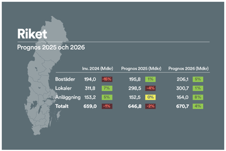 Minskade statliga väginvesteringar innebär att de totala anläggningsinvesteringarna väntas vara oförändrade under innevarande år, medan planerade satsningar på järnvägen får positiv effekt 2026.