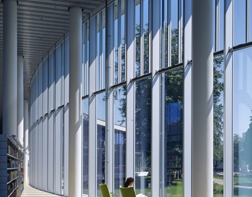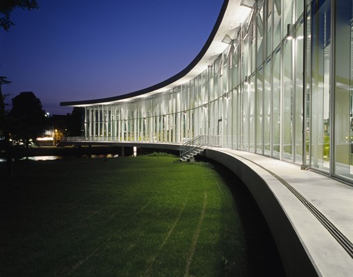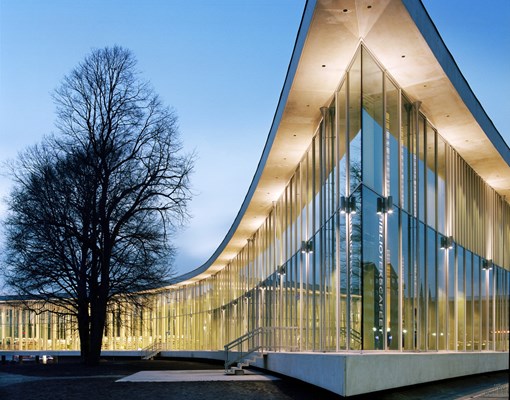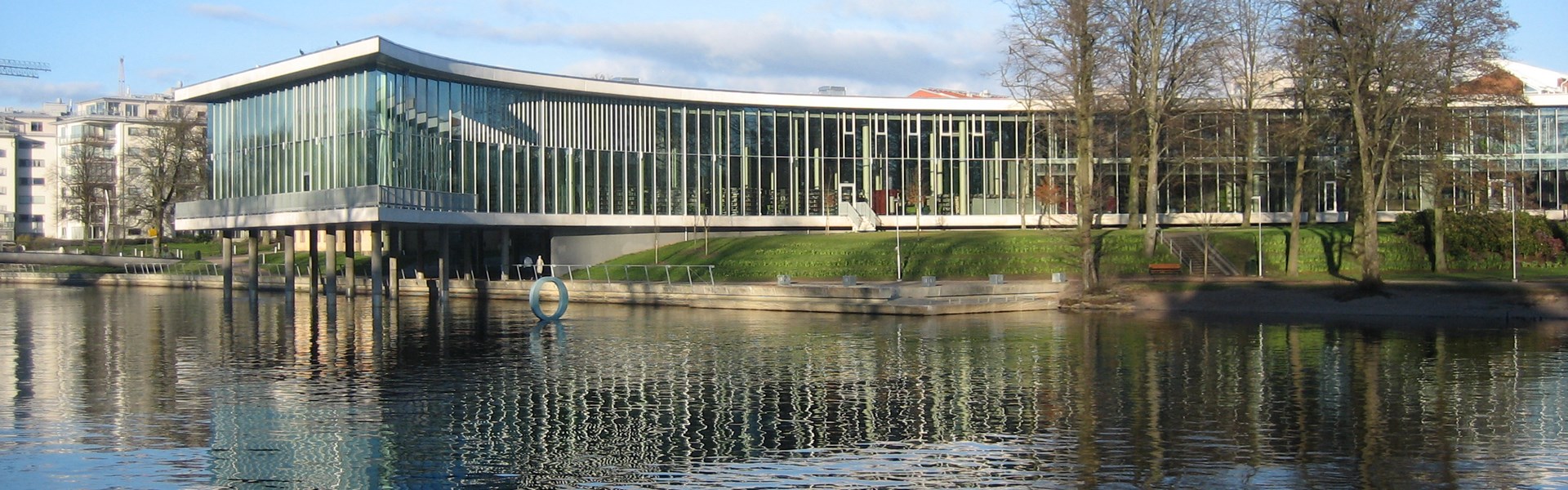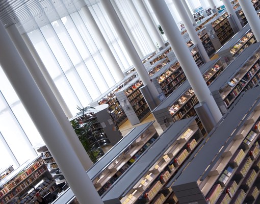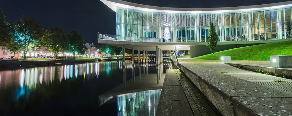 Det centralt placerade biblioteket är en självklar samlingspunkt och ett riktmärke i staden. De stora ytorna och den mjukt konkava utformningen av fasaderna skapar tillsammans med Nissans flödande vatten, parkmiljön och de omslutande träden en behaglig stämning. Här kan man studera inför tentamen, slå sig ner med en bok ur hyllorna eller dra sig undan med senaste numret av favorittidskriften. Biblioteket i Halmstad inrymmer också kafé, nyhetsrum, sagorum och föreläsningssalar.