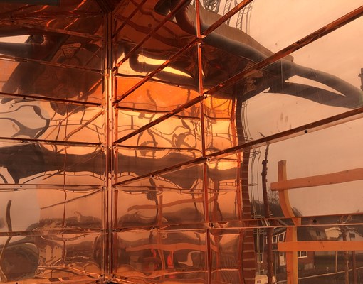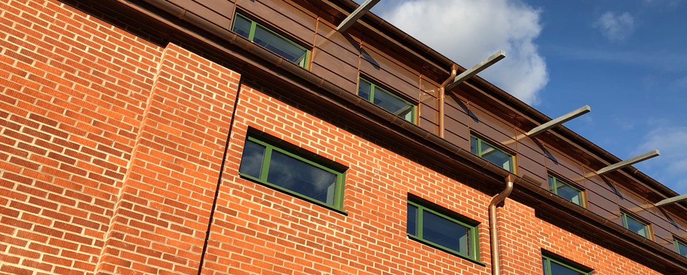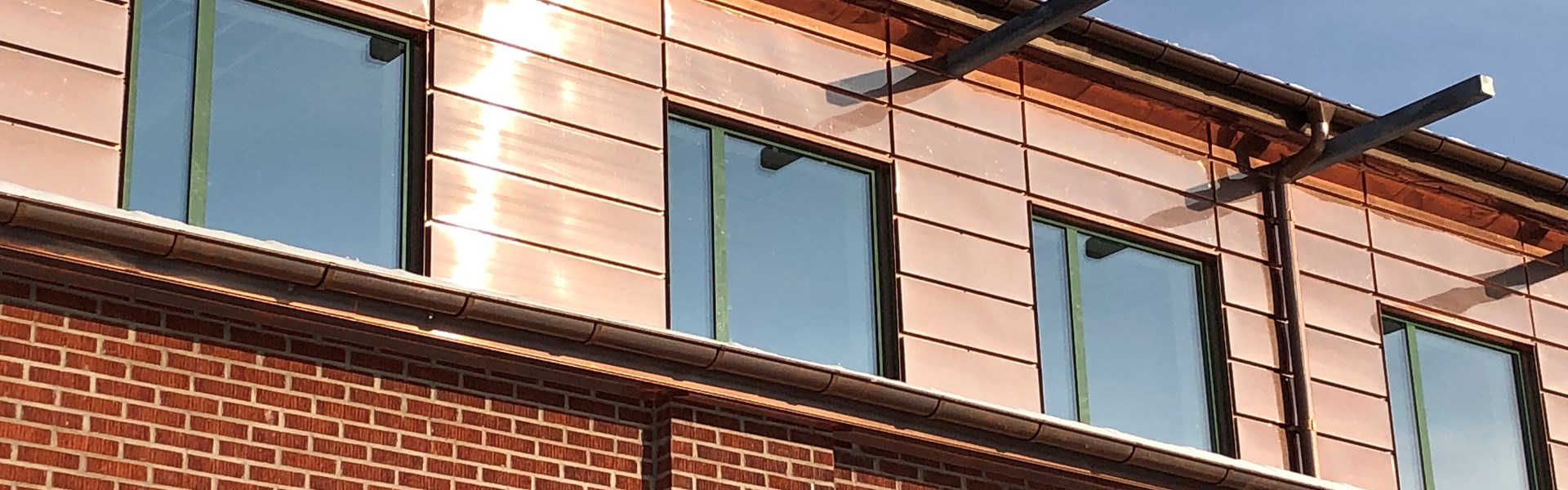 Kontoret utförs i tre våningsplan med fasad av tegel. Bandtäckt kopparplåt på tak samt solpaneler på industridelen.